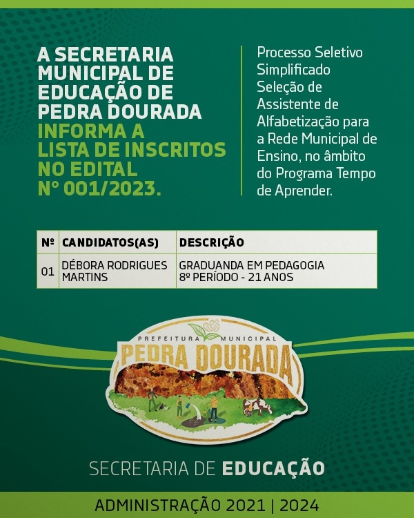 A Secretaria Municipal de Educação de Pedra Dourada informa a lista de inscritos no Edital n° 001/2023 — Processo Seletivo Simplificado Seleção de Assistente de...