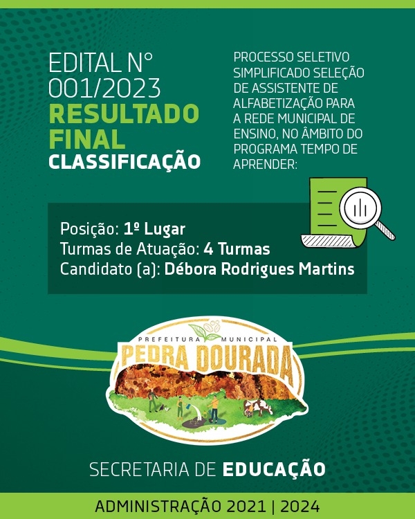 A Secretaria Municipal de Educação de Pedra Dourada informa a Pontuação dos candidatos inscritos: no Edital n° 001/2023. CANDIDATOS (AS): DÉBORA RODRIGUES MARTI...